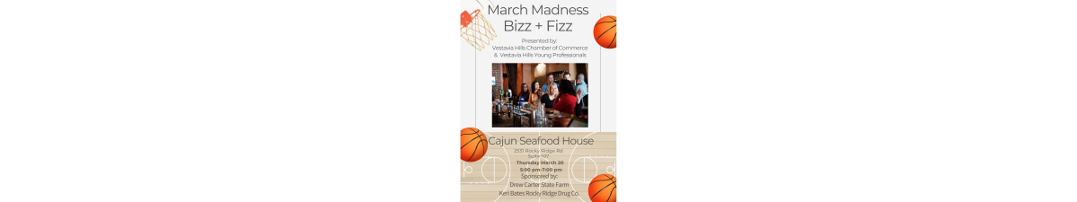 Bizz and Fizz Date and Time Thursday Mar 20, 2025 5:00 PM - 7:00 PM CDT March 20, 2025 5 pm-7 pm Location Cajun Seafood House 2531 Rocky Ridge Rd Suite 107 Bizz and Fizz Set a Reminder Enter your email address below to receive a reminder message. Email address Select the amount of Days before the event -- Select Days Before Event -- 1 Day 2 Days 3 Days 1 Week Captcha Validation Please complete the Captcha Submit Description Presented by The Vestavia Hills Chamber of Commerce and The Vestavia Hills Young Professionals Set a Reminder Enter your email address below to receive a reminder message. Email address Select the amount of Days before the event -- Select Days Before Event -- 1 Day 2 Days 3 Days 1 Week Captcha Validation Please complete the Captcha Submit Share × Print Email Add to Calendar Facebook Twitter LinkedIn Tell a Friend × Select Calendar Type × Google Yahoo iCal (Outlook, Apple, or other)