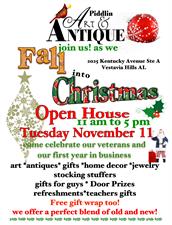 Join us for our Fall into Christmas Open House from 11 am to 5 pm on Tuesday November 11th. Come help us celebrate our Veterans and our one year anniversary of being in business! We will have refreshments and Door Prizes. Don't let some of the one of a kind items get away! We Gift Wrap for FREE. Let us be your one stop shop. In and out if you're in a hurry or browse for as long as you want!